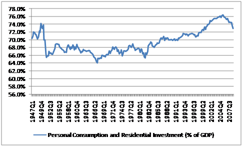 From the early 1950's to the early 1980's, personal consumption expenditures as a percent of GDP ran in the range of 62-63%. From 1982 to 2007, it climbed to 70%. Big surges came in the early 1980s and late 1990s, coincident with big stock market booms and high, disinflationary economic growth. These were also periods with a very strong and rising US dollar. Residential investment was strong in those times and in the late 1980s and mid 2000s Given the large supply/demand imbalance in housing, baby boomers needing to save for retirement, and the badly weakened financial sector, it would not be surprising to see the combination of residential investment and consumer spending to fall below the pre-1980s level of 68% of GDP in the next few years, a full 8 percentage points less than the peak level in 2005. We should also expect consumer debt to GDP to revert back to the early 1990s level of around 60%, a process that will probably take a decade or so.