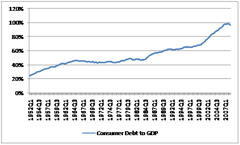 The Obama administration projects US budget deficits in excess of 10% of GDP for the next two years and around 5% of GDP for the next several years thereafter. These are massive figures unseen since World War II. It would not be surprising to see Federal debt to GDP rise to 70-80% of GDP by the end of Obama's first term. Such a rise could fully offset a decline in consumer debt to GDP back to early 1990s level of around 60% from the current 100%.