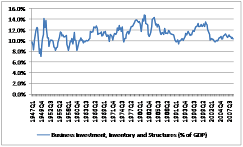 Booms and busts are caused by fluctuations in business investment, which get exaggerated by the expansion and contraction of the balance sheets of leveraged banks. Instead of focusing on the core of the problem, bank leverage, we have been hunting for a methodology to cure the symptoms of the problem, which are contractions in demand and debt deflation. Keynes advocated using government spending to offset periods of weak business investment, but he would have also advocated the government run surpluses when business investment was strong. Supply-siders advocated reducing taxes on investment and deregulating the business sector to encourage more business investment relative to government spending, which would increase productivity and lead to faster GDP growth. As was noted above, in the 1980s and 2000s, Republican administrations implemented a combination of Keynesian defense spending and investor-oriented tax cuts to offset weak business investment, while in the 1970s and 1990s, more liberal administrations cut defense spending and raised taxes during periods of strong business investment. In other words, the US electorate has actually successfully managed fiscal policy by changing the mix of Republicans and Democrats in Washington.